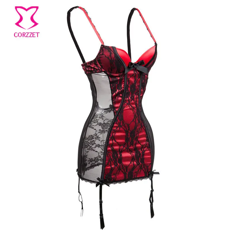 BEST Corzzet Red Satin&Black Lace Sexy Chemise Nightwear Dress Hot Shaper Garter Sexy Lingerie Plus Size